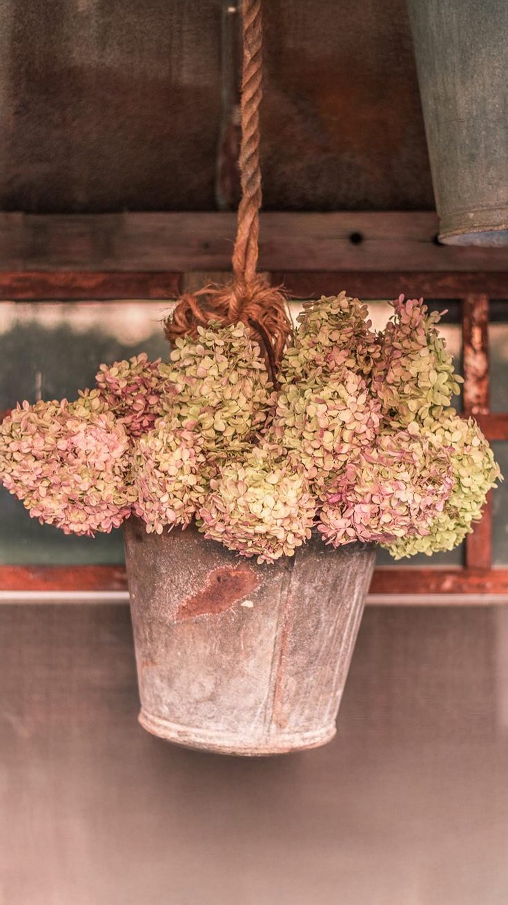 Dried hydrangeas spill over a timeworn tin bucket, giving off an old-world vibe.