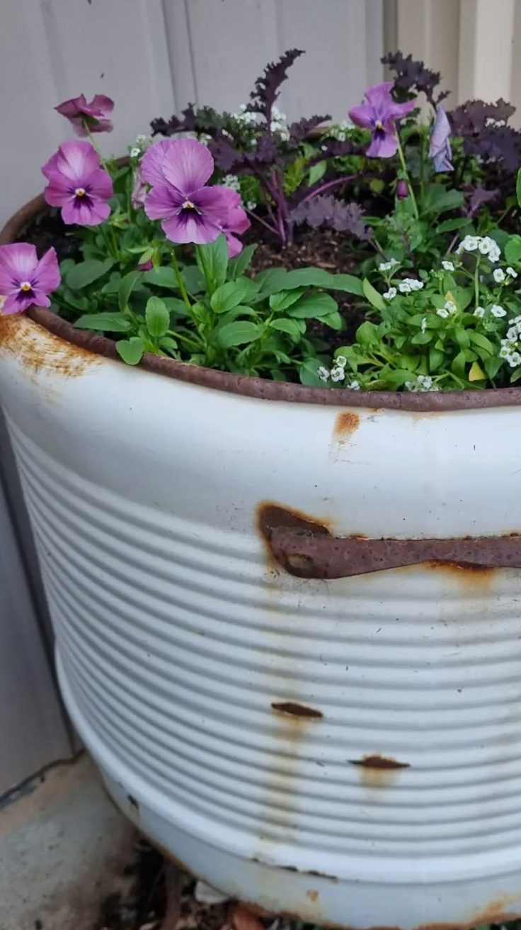 An old, rust-speckled metal tub makes for a unique planter. It’s got a weathered feel with patches of corrosion adding character. The tub’s white surface contrasts nicely with the vibrant greens and purples of the flowers inside.