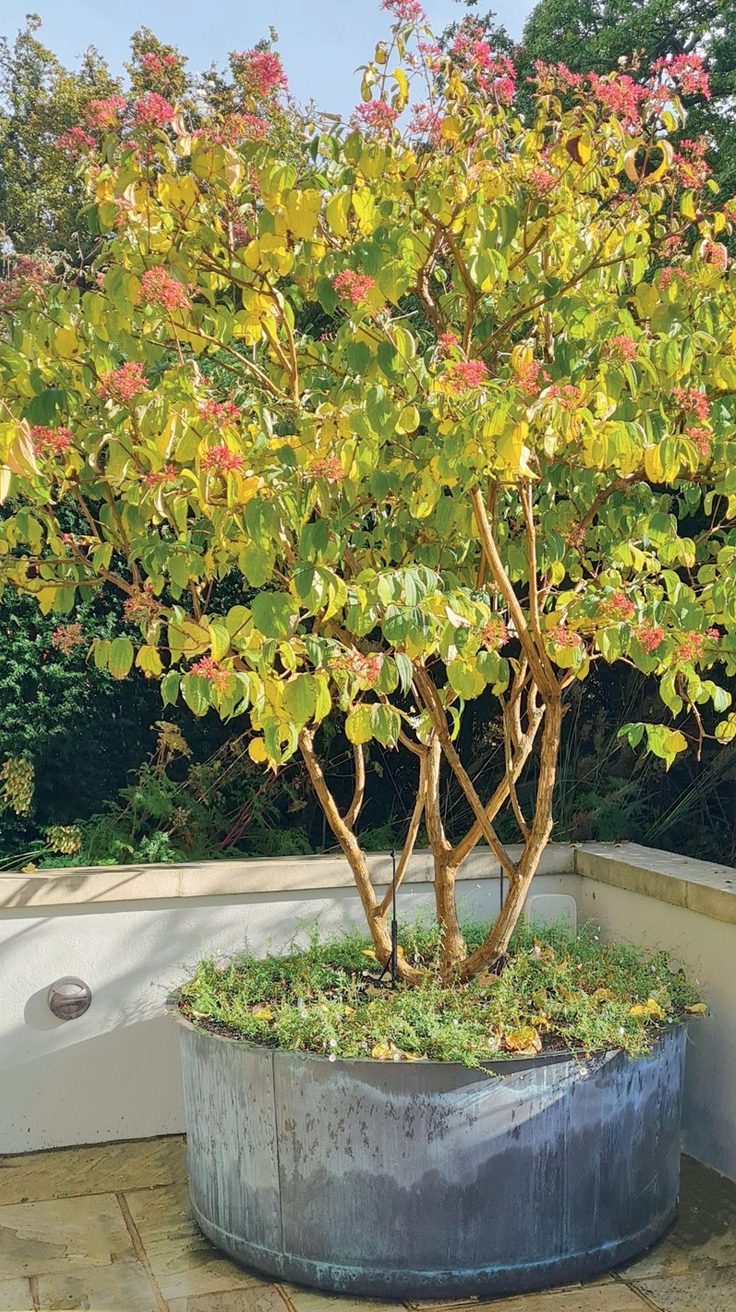 Bright yellow and green leaves catch your eye immediately, with pops of pink flowers adding a cheerful touch. Standing tall in a large, cylindrical planter, this tree is a centerpiece. The planter has a weathered look, giving a rustic vibe that complements the plant’s natural beauty.