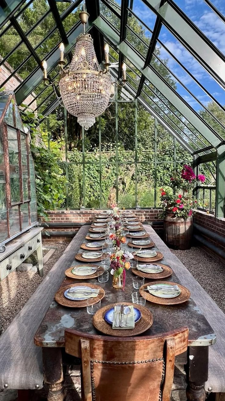A sparkling chandelier hangs dramatically in a greenhouse setting, catching your eye immediately. The glass roof and walls let in tons of natural light, giving the space a bright, open feel. Brick walls add a touch of rustic charm, while lush greenery peeks through the glass, blurring the line between indoors and out.