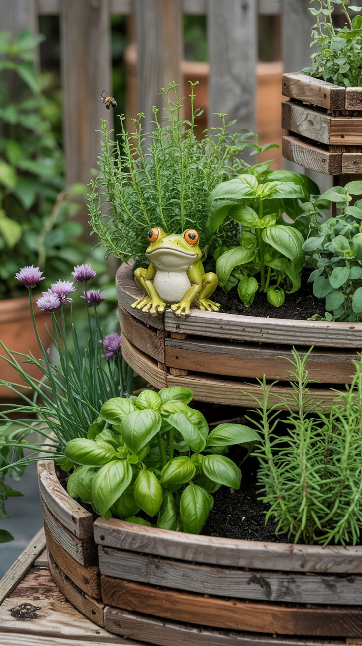 In the image, you can see a beautifully arranged herb spiral featuring lush basil, vibrant chives, and aromatic rosemary. The spiral design is made from sturdy materials, which adds a rustic charm to any garden. The presence of a whimsical frog statue adds a playful touch, inviting bees and other pollinators to visit.