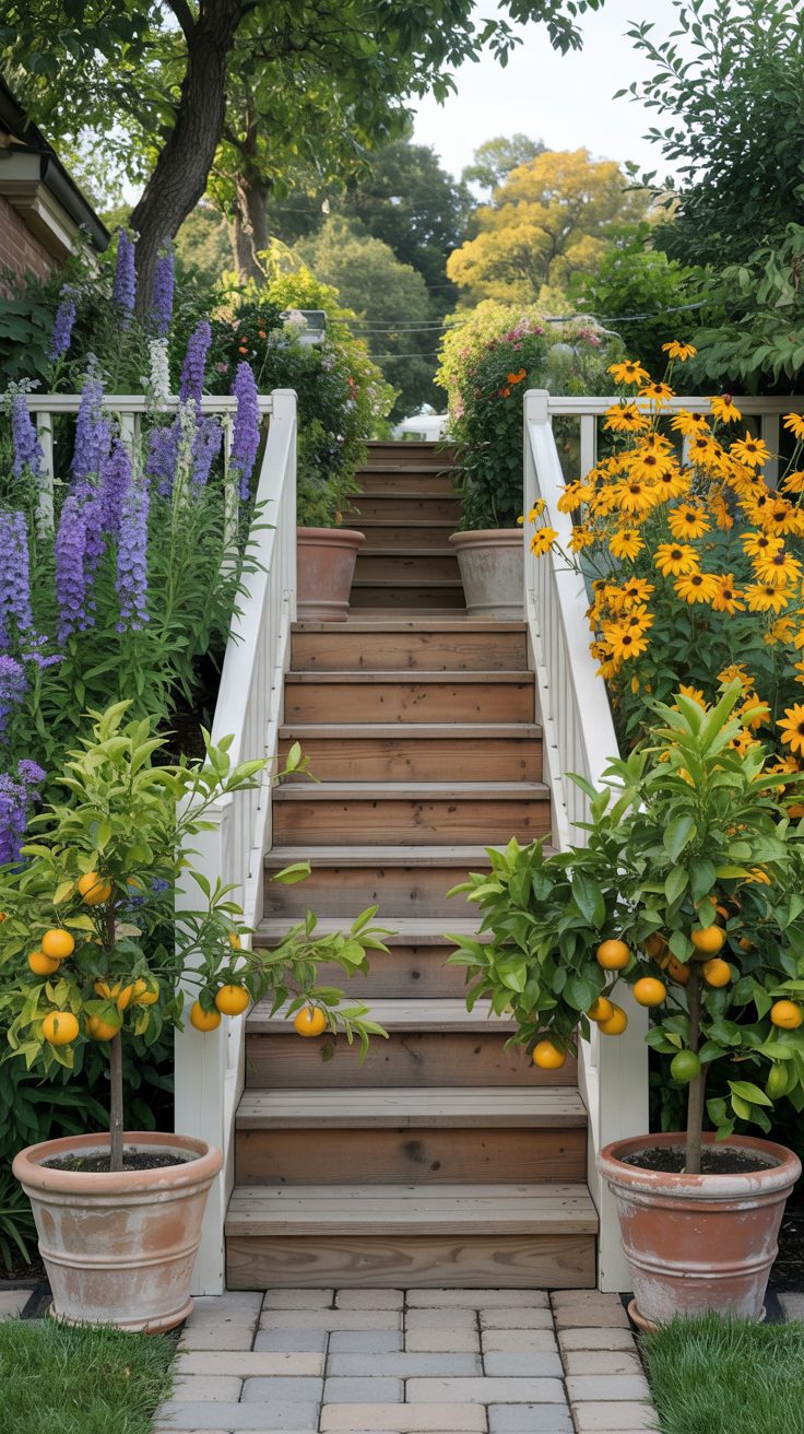 Imagine walking up a set of beautiful wooden steps, flanked by vibrant flowers and lush greenery. This scene captures the essence of a sun-drenched garden, where every step feels like a stroll through nature’s beauty.