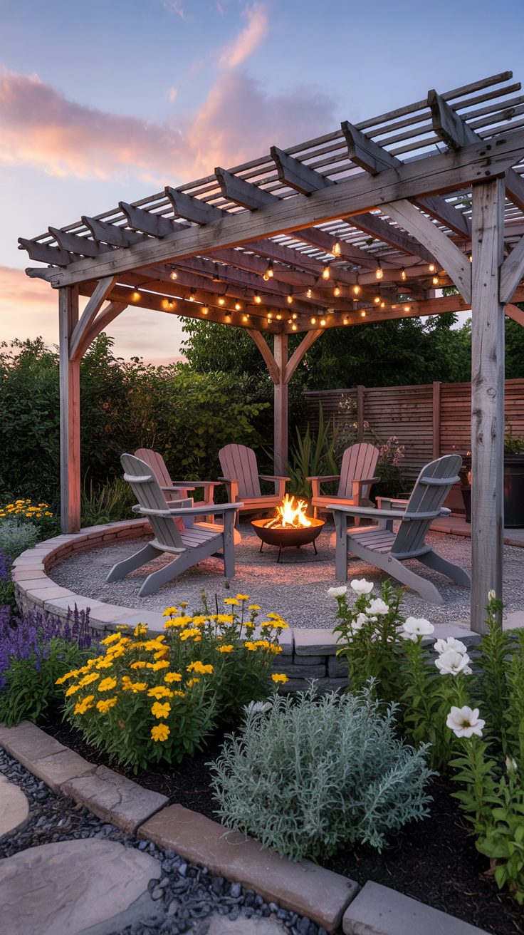 The circular seating arrangement around a fire pit invites friends and family to gather. It’s an ideal spot for sharing stories, roasting marshmallows, or simply enjoying the warmth of the fire. The surrounding flowers and greenery enhance the natural beauty, making it a peaceful retreat.