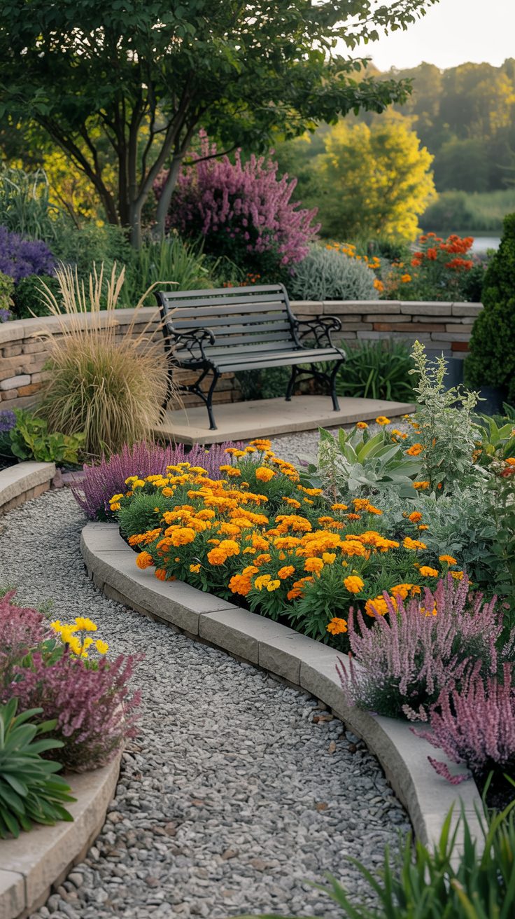 Imagine a garden that comes alive as the sun sets, casting a warm glow over vibrant flowers. This scene captures that magic perfectly. The garden features a stunning array of colorful blooms, including bright orange marigolds and delicate purple salvia, all nestled in beautifully arranged stone beds.