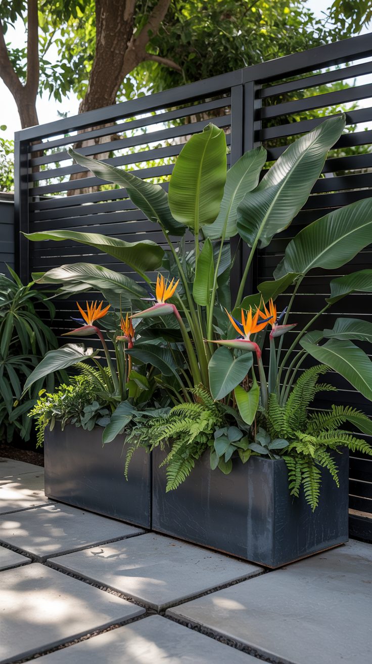 Creating a contemporary patio is all about blending style with nature. This image showcases a sleek design featuring bold planters filled with lush greenery. The combination of ferns and vibrant bird of paradise plants adds a tropical touch, making the space feel inviting and fresh.