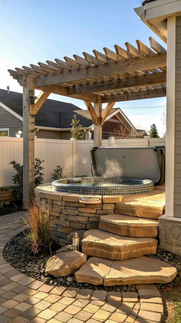 This dreamy backyard corner is bringing serious spa-retreat energy right to your home. A circular stone-wrapped hot tub gently steams under a rustic wooden pergola, perfectly framed by creamy pavers and warm golden light. The layered stone steps feel organic yet intentional, leading you into total relaxation mode one footstep at a time.