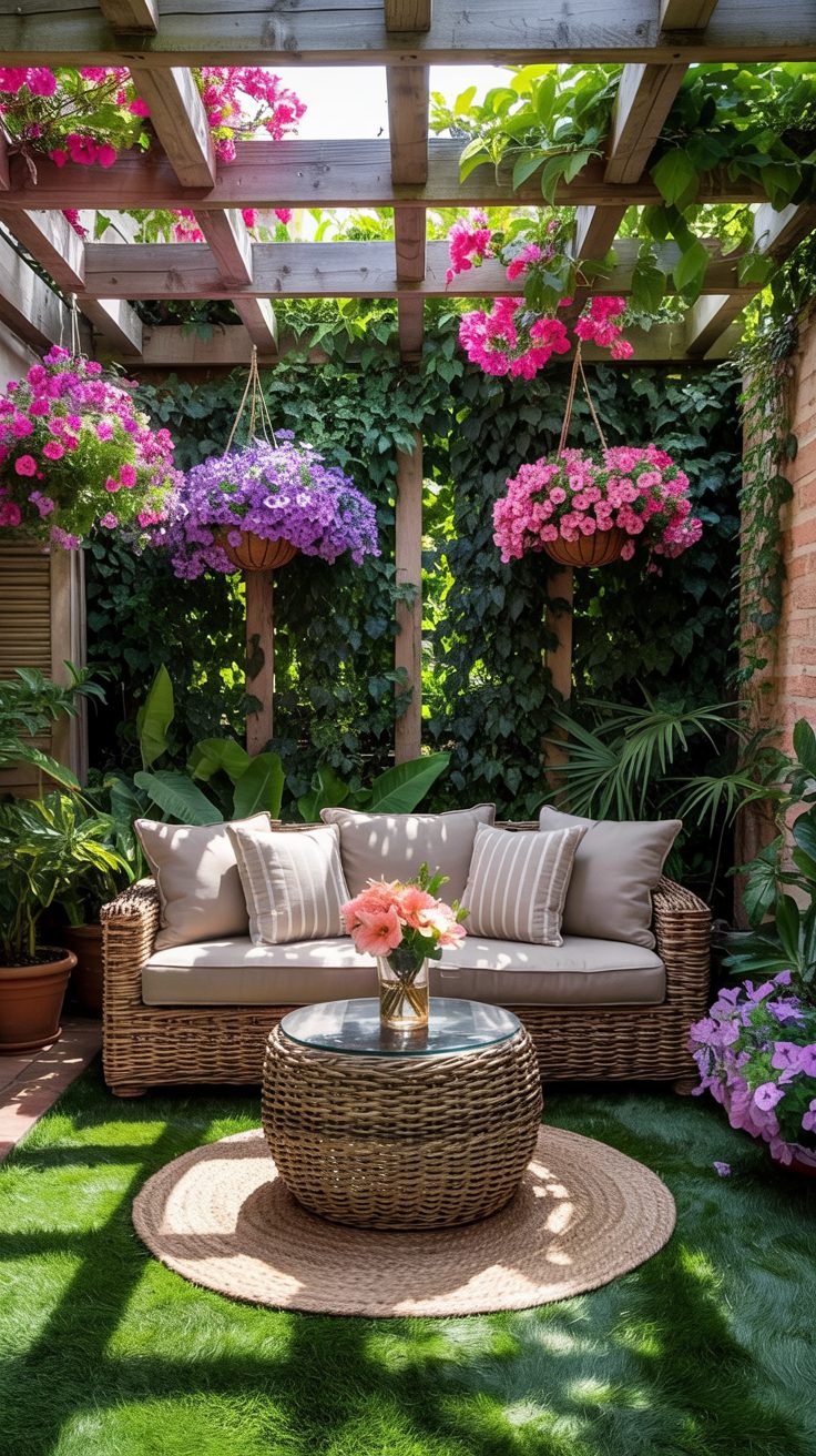 Step into your new favourite chill zone! This lush, flower-filled pergola is a dreamy mix of cosy and chic—perfect for summer lounging or hosting an alfresco brunch. Overhead, brilliant pink and purple blooms cascade from rustic hanging baskets, their petals catching the afternoon sun through a crisscross of wooden beams and trailing vines.