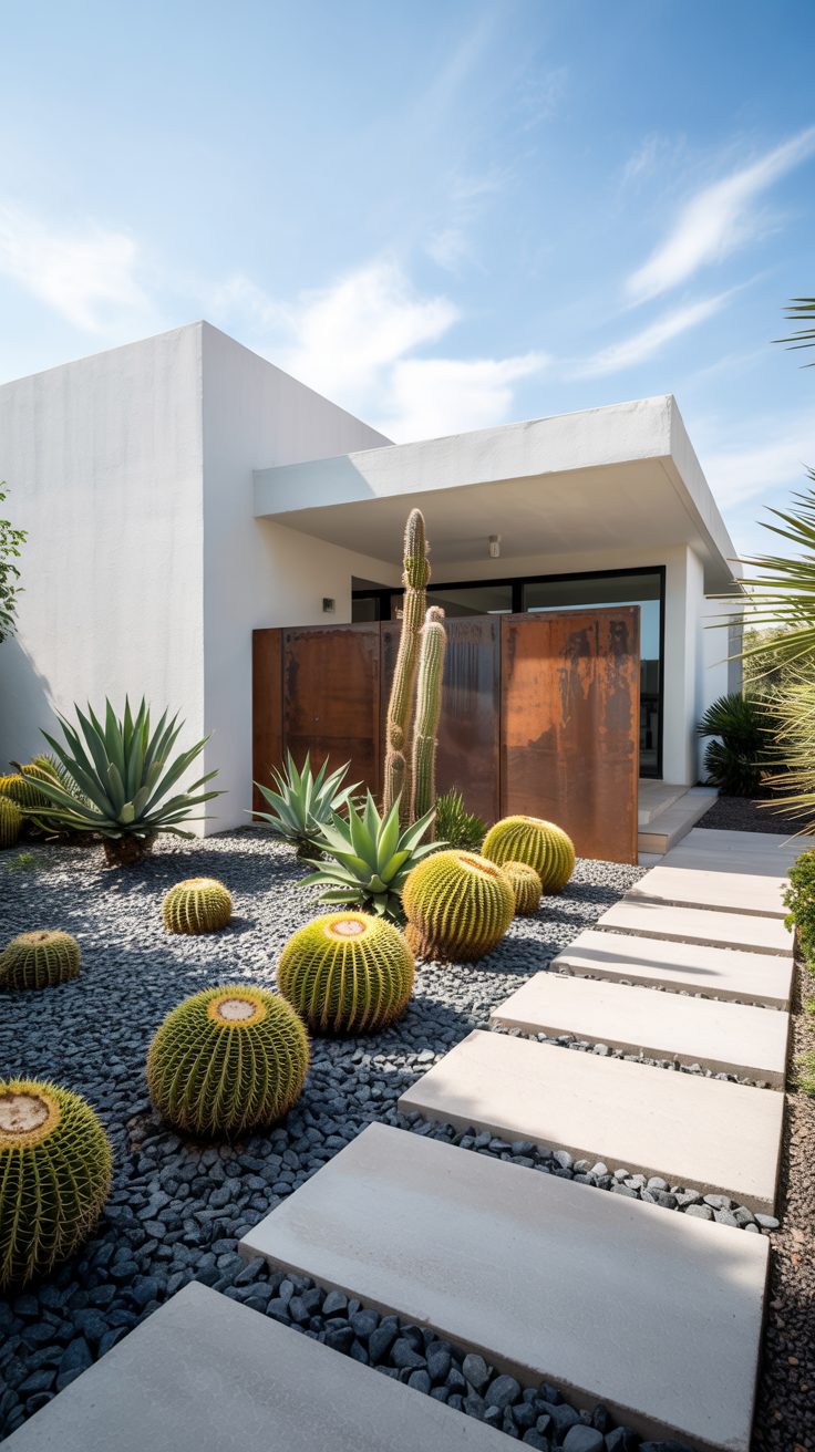 The standout feature here is the round golden barrel cacti, which add a pop of color and texture. Their unique shape contrasts beautifully with the sleek, modern lines of the home. The use of large, flat stone pavers creates a pathway that invites guests to explore the space while maintaining a clean and organized look.