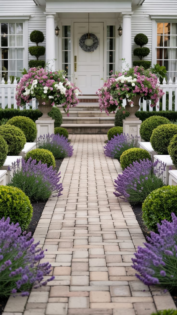 Imagine walking up to a home where the path is lined with vibrant lavender. This stunning entryway creates a warm and inviting atmosphere. The deep purple hues of the lavender contrast beautifully with the soft greens of the neatly trimmed boxwoods on either side.
