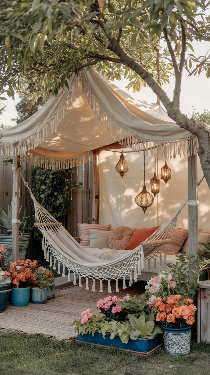 Don’t forget the lighting! Hanging lanterns or fairy lights can create a magical atmosphere as the sun sets. A hammock nearby adds an extra layer of relaxation, inviting you to unwind and soak in the beauty of your garden.