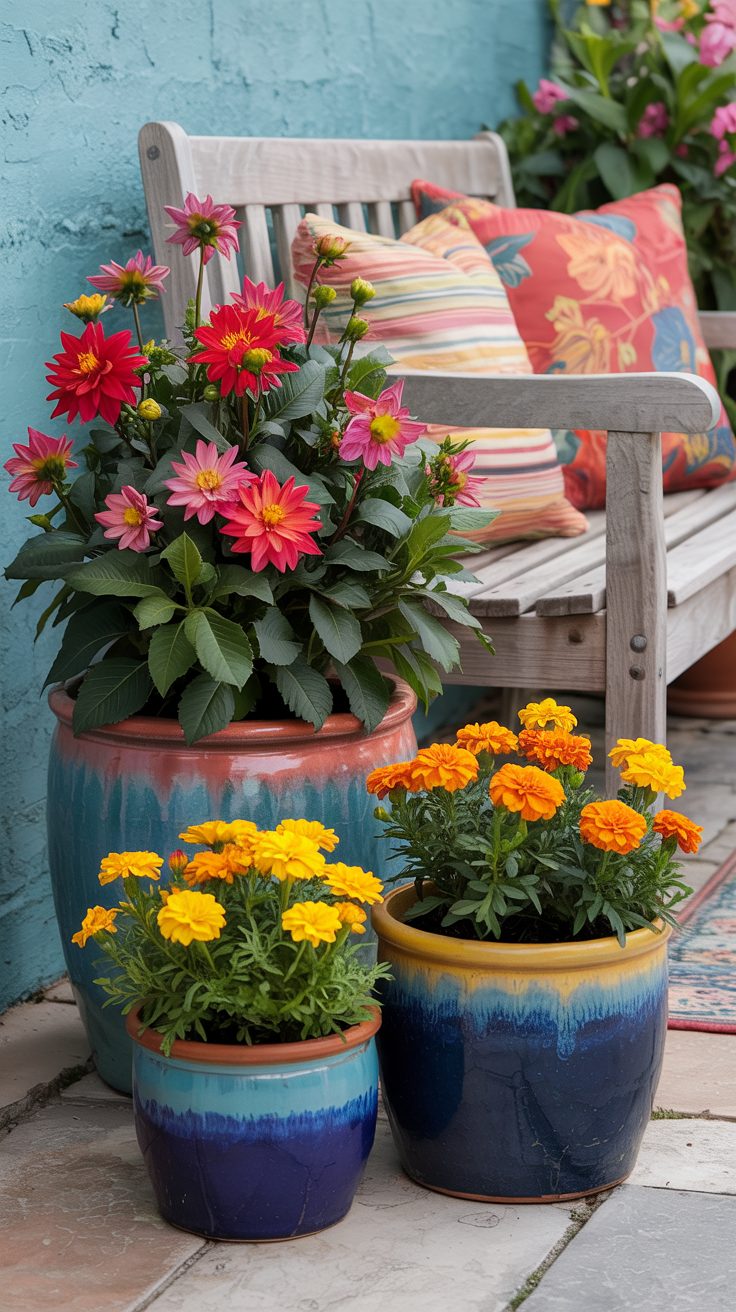 Summer is the perfect time to brighten up your outdoor space, and bold patio planters are a fantastic way to do just that. Imagine vibrant flowers bursting with color, drawing attention and creating a lively atmosphere. In the image, we see a collection of beautifully arranged planters, each showcasing a mix of red dahlias and cheerful marigolds. The deep blue pots contrast beautifully with the colorful blooms, making them pop even more.