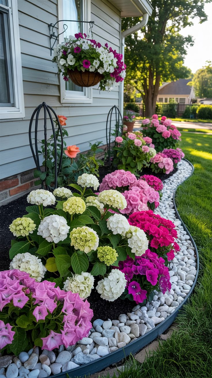 Say hello to a front yard that’s totally stealing the show! This vibrant border bed is bursting with hydrangeas and petunias in soft whites, playful pinks, and fuchsia tones. Framed with a clean black edging strip and filled with smooth white river rocks, it’s a fresh, low-maintenance twist that instantly elevates any home’s exterior.