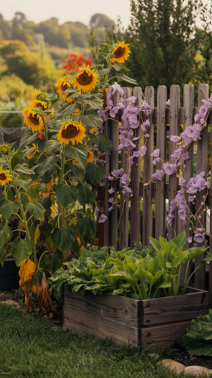 In this setup, sunflowers stand proudly against a wooden fence, providing a cheerful and inviting atmosphere. The contrast between the bright yellow flowers and the earthy tones of the fence enhances the overall appeal. Adding purple flowers, like hollyhocks, alongside the sunflowers adds depth and variety, making the space feel lively.