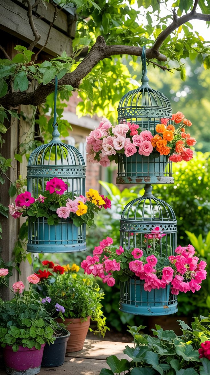 Talk about thinking outside the (flower) box! These vintage-style birdcages-turned-planters are the ultimate garden glow-up, adding instant charm and creativity to any outdoor nook. Hanging from a twisting tree branch, each teal-painted cage bursts with lush blooms—pansies, roses, ranunculus, and petunias—all in joyful pops of pink, orange, and yellow.