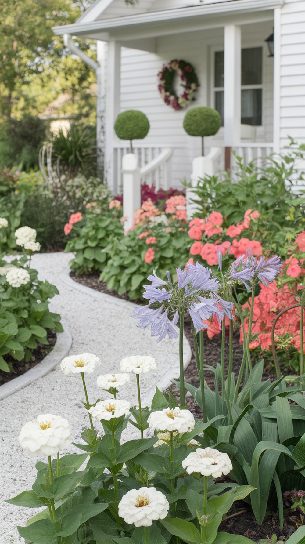 This front yard is a delightful blend of crisp white and vibrant coral flowers. The white blooms, likely zinnias, stand out beautifully against the lush greenery and colorful coral geraniums. The winding path, made of light-colored gravel, invites you to explore the garden further.
