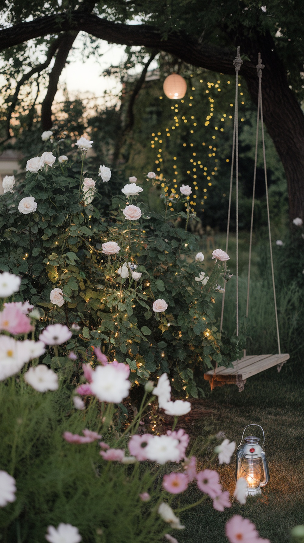 In this enchanting setup, roses climb gracefully, their petals softly illuminated. The gentle swing nearby adds a playful touch, perfect for relaxing under the stars. A lantern rests on the ground, enhancing the cozy vibe and providing a charming focal point.