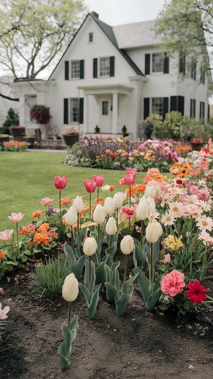 This dreamy front yard is what happens when a Jane Austen novel meets Pinterest perfection. A classic white clapboard home with black shutters sets the backdrop, while a riot of tulips, daisies, ranunculus, and zinnias spill across the lawn like a watercolor painting in full bloom. The front garden beds are layered with early spring color—ivory and blush tulips lead the way, surrounded by soft peach and pink florals that look straight out of a botanical fairytale.