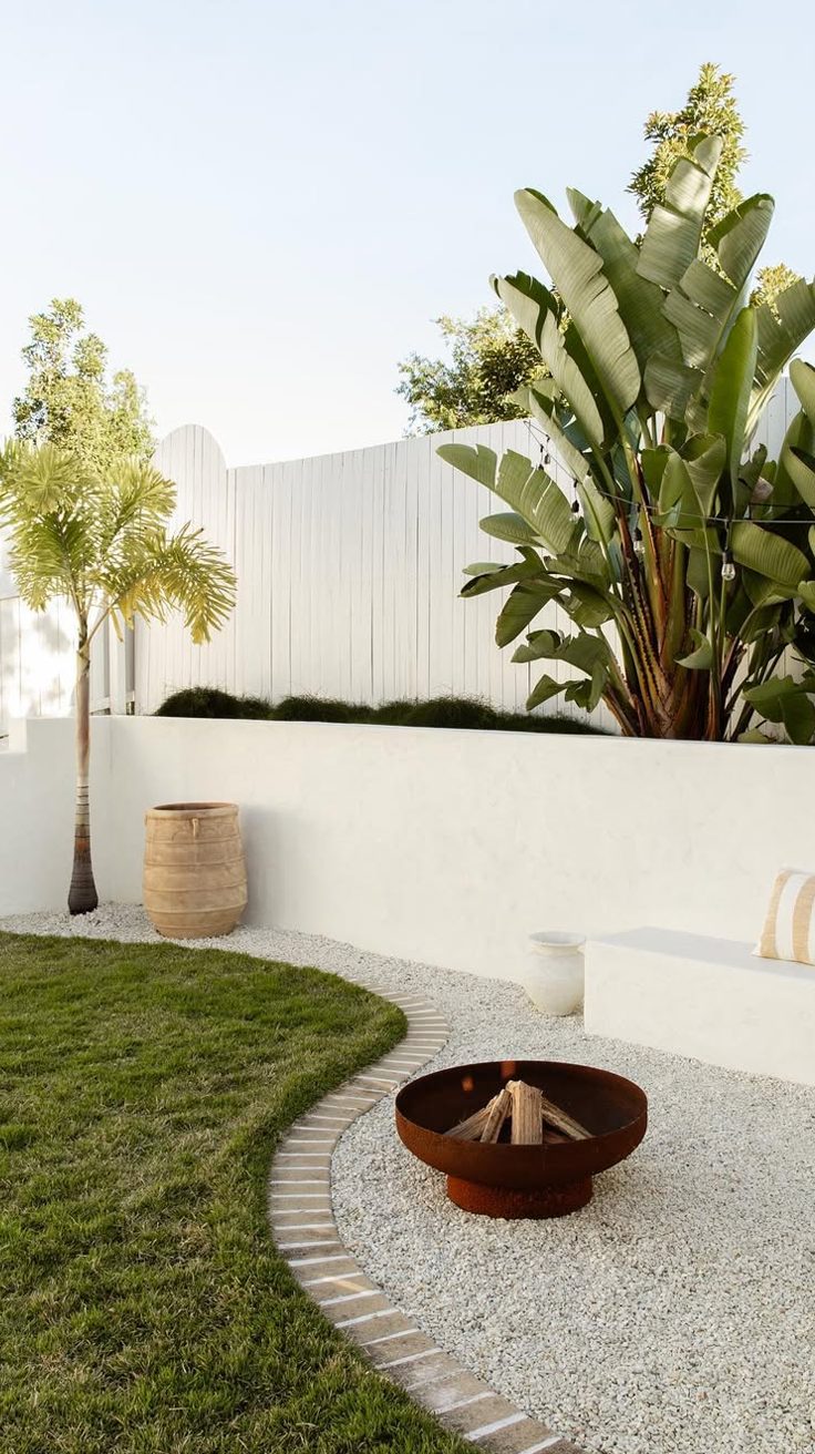 This dreamy modern backyard proves that less really is more. Clean white walls, soft gravel paths, and sculptural tropical plants create a serene, sun-drenched retreat that feels like a luxury holiday without leaving home. The soft curve of the green lawn against the pale patio is perfectly bordered with tan bricks, adding a quiet but elegant detail.