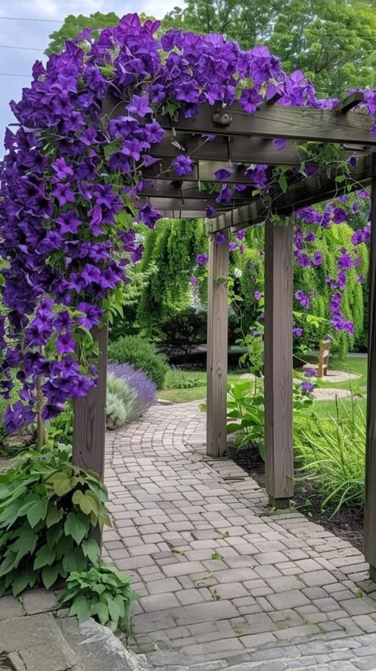 Step into a real-life fairy tale with this enchanting garden pergola, completely drenched in vibrant purple clematis blooms. The deep wooden structure contrasts beautifully with the rich green foliage and whimsical lavender hues. A winding cobblestone path draws your eye through the arbor and into the dreamy summer garden beyond—inviting you to wander, breathe, and just be.
