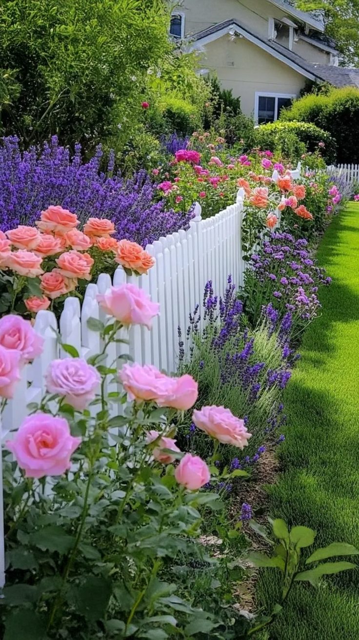 The crisp white fence gives major curb appeal while framing the garden like a romantic painting. Whether you’re sipping morning coffee on the porch or welcoming summer guests, this setup is an instant mood-booster.