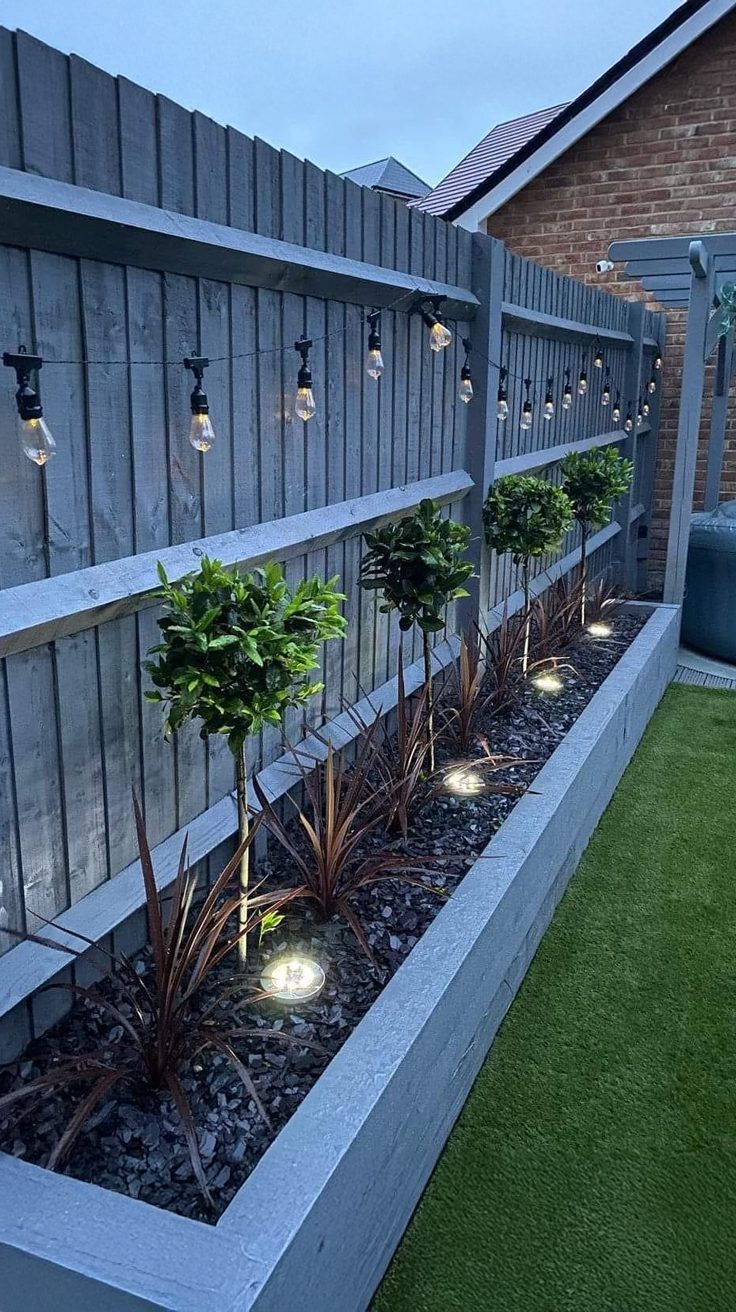 This backyard raised bed setup is giving moody modern vibes with minimal effort. Painted in cool slate grey, the custom planter pops against the matching fence, giving the whole area a polished, cohesive look. Clean lines meet soft uplighting as strategically placed spotlights gently illuminate the row of lollipop topiary trees and burgundy ornamental grasses below.