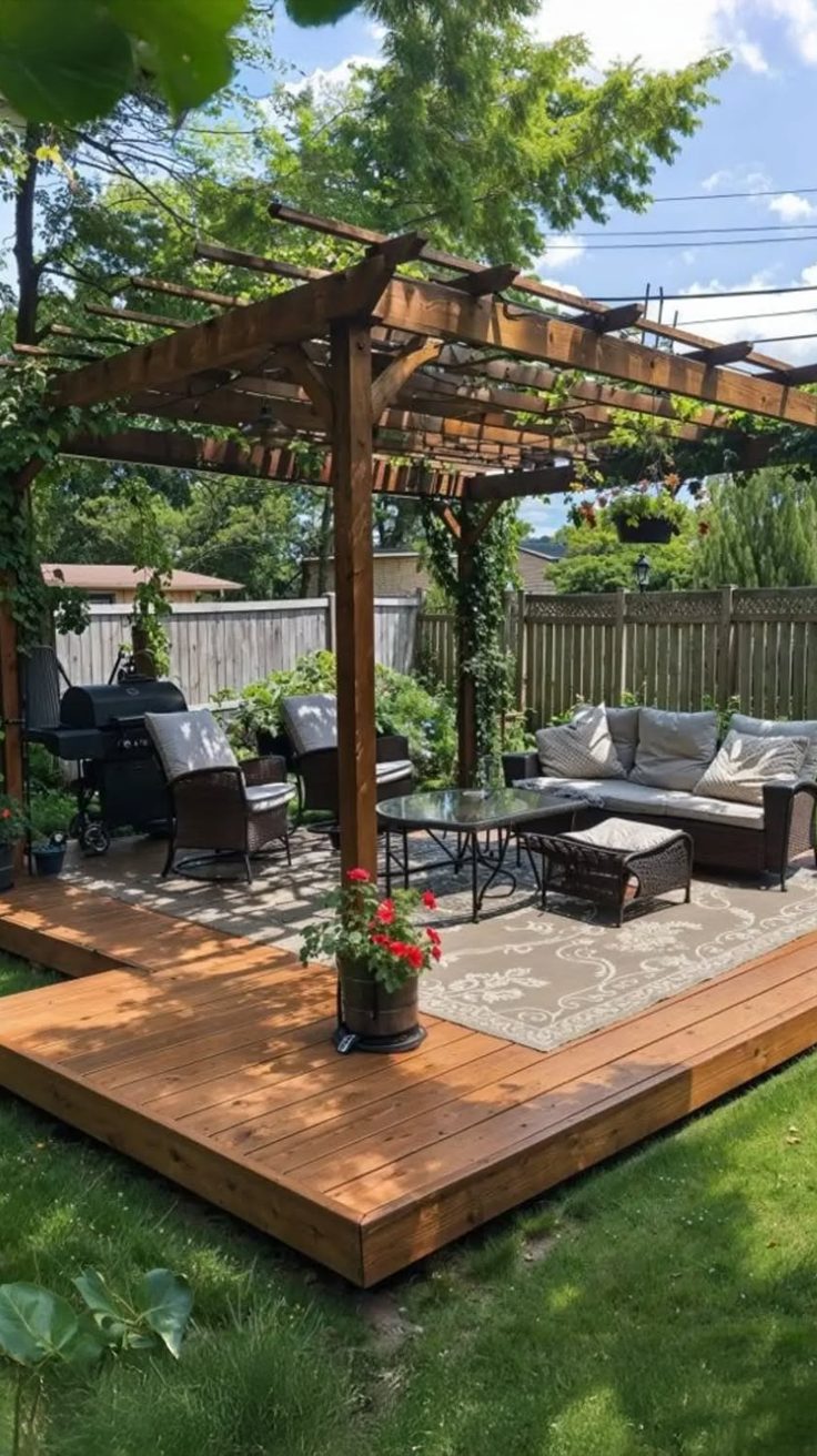 This sun-kissed wooden deck is serving serious backyard goals. A sturdy, vine-wrapped pergola stretches overhead, casting just the right amount of dappled shade onto a cozy outdoor lounge space. Think rattan chairs, a cushy sofa, and a soft outdoor rug that ties it all together—yep, it’s giving “every weekend BBQ at ours” vibes.