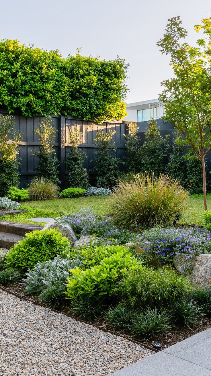 Look closer and you’ll spot architectural plants like lamb’s ear and ornamental grasses mingling with low shrubs and flowering perennials. It’s a mix that screams low-maintenance luxury—perfect for summer evenings with a cold drink in hand. Plus, that sharp-edged stone step? Chef’s kiss for contemporary garden design.