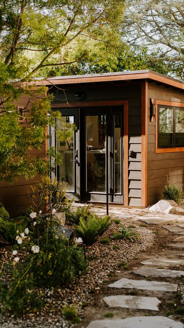 Tucked beneath a leafy canopy, this modern garden studio looks like something straight out of a design magazine. The rich cedar trim, matte black-framed glass doors, and slatted siding give it that perfect blend of rustic charm and sleek modernism. Surrounded by soft gravel, sculptural plants, and a casual flagstone path, it’s a vibe—calm, intentional, and oh-so-inviting.