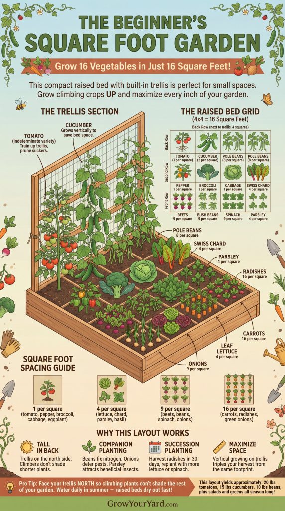 A 4×4 foot raised bed gives you 16 individual square-foot planting sections. This compact design is ideal for beginners because it’s manageable, requires less water and weeding than traditional gardens, and can produce an impressive harvest from spring through fall.